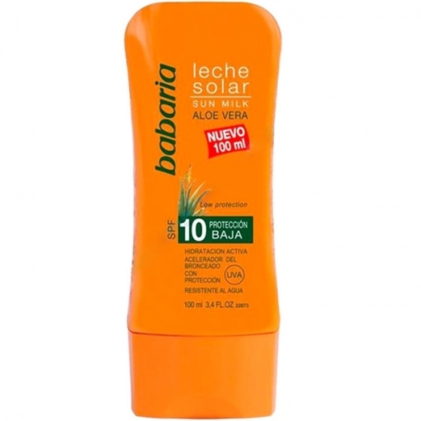 Leche protectora solar de Babaria SPF10 con Aloe Vera. Protección UVA (causantes del envejecimiento prematuro de la piel), UVB e Infrarrojos.