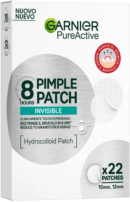 Parches antigranitos de Garnier Pure Active, diseñados para reducir la visibilidad de los granitos en un periodo de 8 horas. Estos parches invisibles son clínicamente probados y ofrecen una protección ultra fina que ayuda a absorber la suciedad y disminuir visiblemente el granito, sin dejar marcas residuales. Cada paquete contiene 22 parches en dos tamaños, permitiendo adaptarse al tamaño de cada granito. Son efectivos en granitos maduros, como los puntos blancos, y se pueden utilizar tanto durante el día como la noche. La aplicación consiste en colocar el parche sobre el granito en piel limpia y seca, dejándolo actuar durante 8 horas para obtener resultados óptimos.