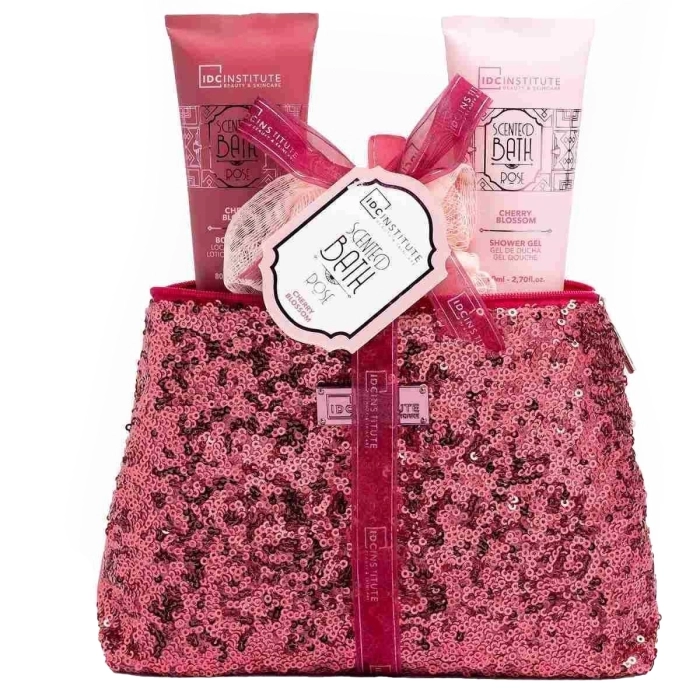 Un elegante set de baño y cuidado corporal, ideal para mimarse a diario o como un regalo especial. La delicada y fresca fragancia de flor de cerezo deja la piel ligeramente perfumada, mientras que el neceser de lentejuelas brillantes le da un toque elegante y glamuroso.