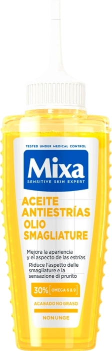 El Aceite Antiestrías de MIXA tiene una textura ligera y sin perfume, sin dejar sensación grasa.