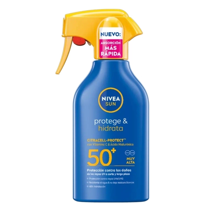NIVEA SUN Protege & Hidrata Spray Solar SPF 50+ con NUEVA fórmula CITRACELL-PROTECT™. La nueva fórmula CITRACELL-PROTECT™ con Vitamina C y Ácido Hialurónico brinda protección contra los daños de los rayos UV a corto y largo plazo. Forma una segunda barrera protectora en el interior de la piel y reduce eficazmente el estrés oxidativo de la piel a nivel celular (in vitro). Además, la nueva fórmula mantiene la piel hidratada durante 48 horas, se absorbe rápidamente y proporciona una sensación de piel sana y suave.