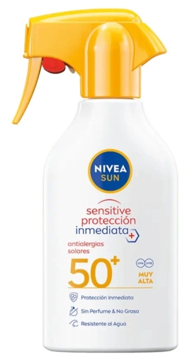 NIVEA SUN Sensitive Protección Inmediata Spray Solar SPF 50+, con su fórmula con protección inmediata y muy alta frente a los rayos UVA/UVB y con antioxidantes, protege la piel de las alergias solares e irritaciones. Especialmente indicada para piel sensible, su fórmula sin perfume con Aloe Vera Bio y antioxidantes es resistente al agua.
