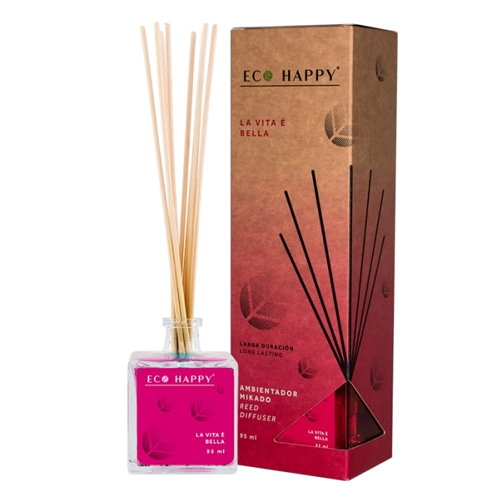 El mikado La vita è Bella de Ecohappy concentra los aceites esenciales del almizcle, la canela y el jazmín. La mezcla de sus esencias da lugar a un intenso aroma que evoca intimidad y sensualidad.