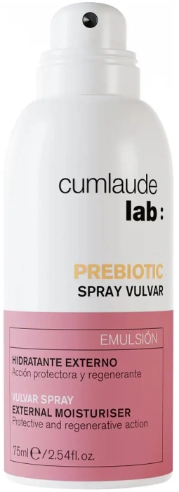 Spray vulvar prebiotic para cuidado íntimo femenino. Actúa como hidratante para la zona vulvar externa. Contiene activos protectores y regenerantes que ayudan a mantener la función barrera de la piel. Presenta textura en forma de bruma para aplicación cómoda y sin contacto directo. Se aplica una o dos veces al día sobre la zona genital externa.